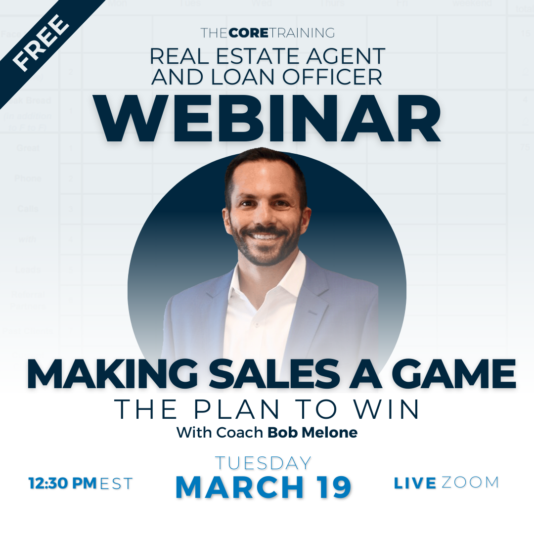 Making Sales A Game Hosted by CORE Coach, Bob Melone Quick LinksResources Testimonials Privacy Policy Subscribe to Emails Our ServiceMortgage Coaching Real Estate Coaching Resources